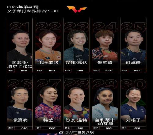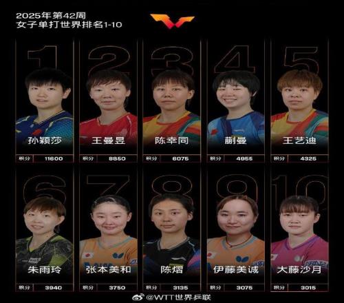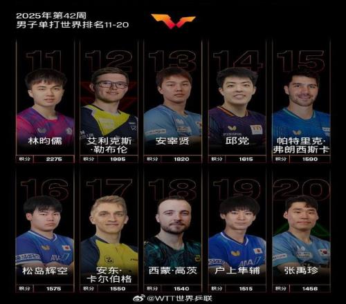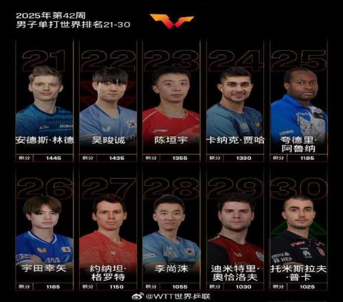 北京時間今日,國際乒聯官方公布了2025年第42周世界排名。