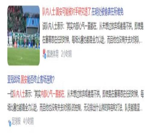 其中一位隊內人士透露,北京國安內部心氣一直都在,從未想過放棄或者是不拼,即使塞蒂恩在隊時,每場比賽也是全力以赴,該人士還同時表示,北京國安之所以變成現在這樣,可能是已經被對手研究透了,被針對了,因為北京國安以前都是以我為主,但是現在北京國安在明處,而對手則是在暗處,所以難免被偷襲。