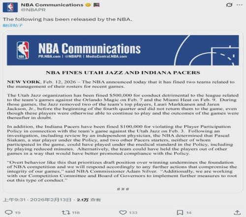 北京時間2月13日上午9點半,NBA開出重磅罰單:爵士被聯盟罰款50萬美元,步行者被罰款10萬美元。此前幾場比賽中,爵士在第四節開始之前換下3J和馬爾卡寧等主力球員。步行者則是違規輪休西亞卡姆,聯盟認為他可以出場。