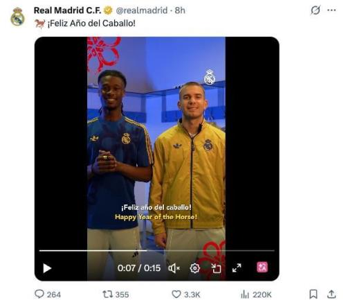 皇馬曬新年祝福視頻,卡馬文加特意用中文說“新春快樂”