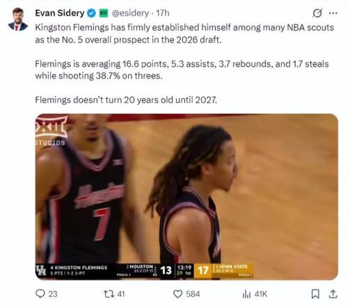 根據埃文-斯迪瑞的報道,金斯頓-弗萊明斯已經在眾多NBA球探心目中穩居2026年選秀大會前五熱門。他本賽季場均16.6分5.3助攻3.7籃板1.7搶斷,三分命中率38.7%,他要在2027年才年滿20歲。