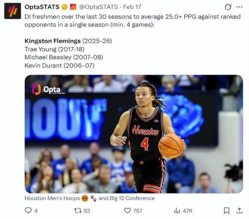 根據數據媒體OptaStats的消息,在過去30個賽季中,大一新生在對陣聯盟排名靠前球隊時能場均達到25分的球員只有特雷楊17-18、比斯利07-08賽季、杜蘭特06-07賽季、弗萊明斯25-26賽季。