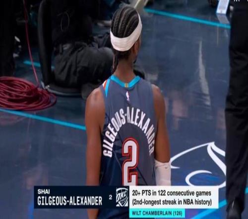 亞歷山大已連續122場砍下20+,距離NBA歷史紀錄張伯倫的126場僅差4場。