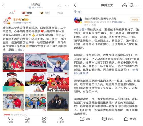 徐夢桃一直在分享訓(xùn)練日常、比賽感悟,李方慧也在賽后發(fā)文并感慨與谷愛凌之間的惺惺相惜,林孝埈、陳夢、孫穎莎等運動員,也均在持續(xù)更新內(nèi)容。