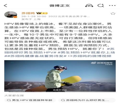 冬奧前夕,默沙東中國借勢賽事熱度,發(fā)布了“呼吁男生預(yù)防HPV”的公益科普項目,該話題自帶的公共價值,加上蘇翊鳴的熱度爆發(fā),引發(fā)了大量針對HPV預(yù)防的討論和科普貼,有效提升了此次預(yù)防HPV的科普效果,該詞條目前有2.6億閱讀量、7.3萬討論量。