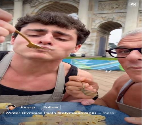 NBC邀請(qǐng)了Gianluca Conte (@itsQCP) 前往開幕式、演播室和各種活動(dòng)現(xiàn)場(chǎng),這位頗受歡迎的網(wǎng)紅將視頻發(fā)布到他的Instagram故事中,與他的340萬(wàn)粉絲分享。他以烹飪內(nèi)容聞名,這次還發(fā)布了一段與一位意大利廚師合作的視頻,他們用奧運(yùn)五環(huán)意面制作了一道菜肴,并在和平拱門前的奧運(yùn)圣火旁享用了這道菜。“這比他寫‘這是我在米蘭-科爾蒂納冬奧會(huì)的每日博客’要真實(shí)得多。”Karapetyan說。